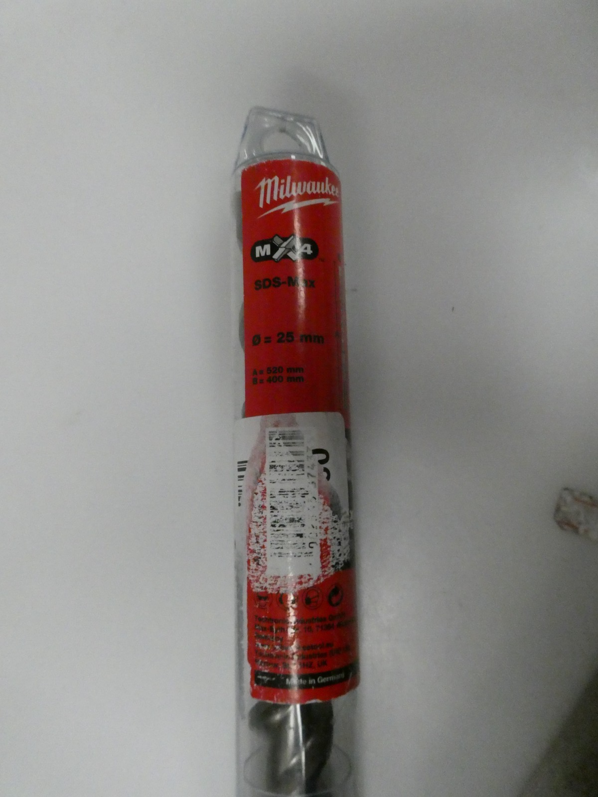 You are buying Milwaukee 4932352775 SDS Max 4 Cut Drill Bit 25 x 520mm, Its new never used.INT REF: B5764Features:deg; symmetry of carbide tip: Reduces jamming up on hitting reinforcing steel.Centering point with 130° point angle: Easy spot drilling with pinpoint accuracy and ensures optimum guidance during drilling.Robust secondary cutter with dynamic curved cutting edge: Supports the primary cutter for faster drilling.Shorter spiral windings: This allows for faster transport of drilling dust from the head to the flute = Less wear and heat build-up at the tip.Unique carbide tip: With more carbide on all diameters and extra carbide on ø > 32mm.Wear mark on both sides of primary cutter: Guarantees diameter accuracy (i.e. for anchor fittings) and acts as a life time indicator in warranty cases.Deep flute shoulders: High volume dust removal for optimum drillingLess wear and heat build-up.Low vibration drilling performance: Comfortable drilling ensures less stress for man and machine.Special surface treatment: Shot blasting provides a smooth surface and densifies the surface structure and makes the bit more wear resistant.PGM Conformity: Guarantees precise holes for anchor fitting over the entire life time of the drill bit.Made in Germany